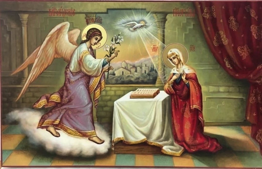 Благовещение празднуется 7 апреля. Эта дата отстоит ровно на 9 месяцев от Рождества Христова. В этот день Архангел Гавриил предстал перед Святой Девой Марией с поистине великой благой вестью. Его приветствие: «Благословенна Ты в женах, и благословен плод чрева Твоего», – не могли не вызвать изумления и трепета в душе Отроковицы. «Как это может случиться со мной – я же мужа не знаю?» – спрашивает Пречистая Дева. «Дух Святой найдет на Тебя и Сила Вышнего осенит Тебя» - отвечает Архангел Гавриил. И Она отдает Себя в руки Божии: «Се, Раба Господня; буди Мне по глаголу твоему…»
