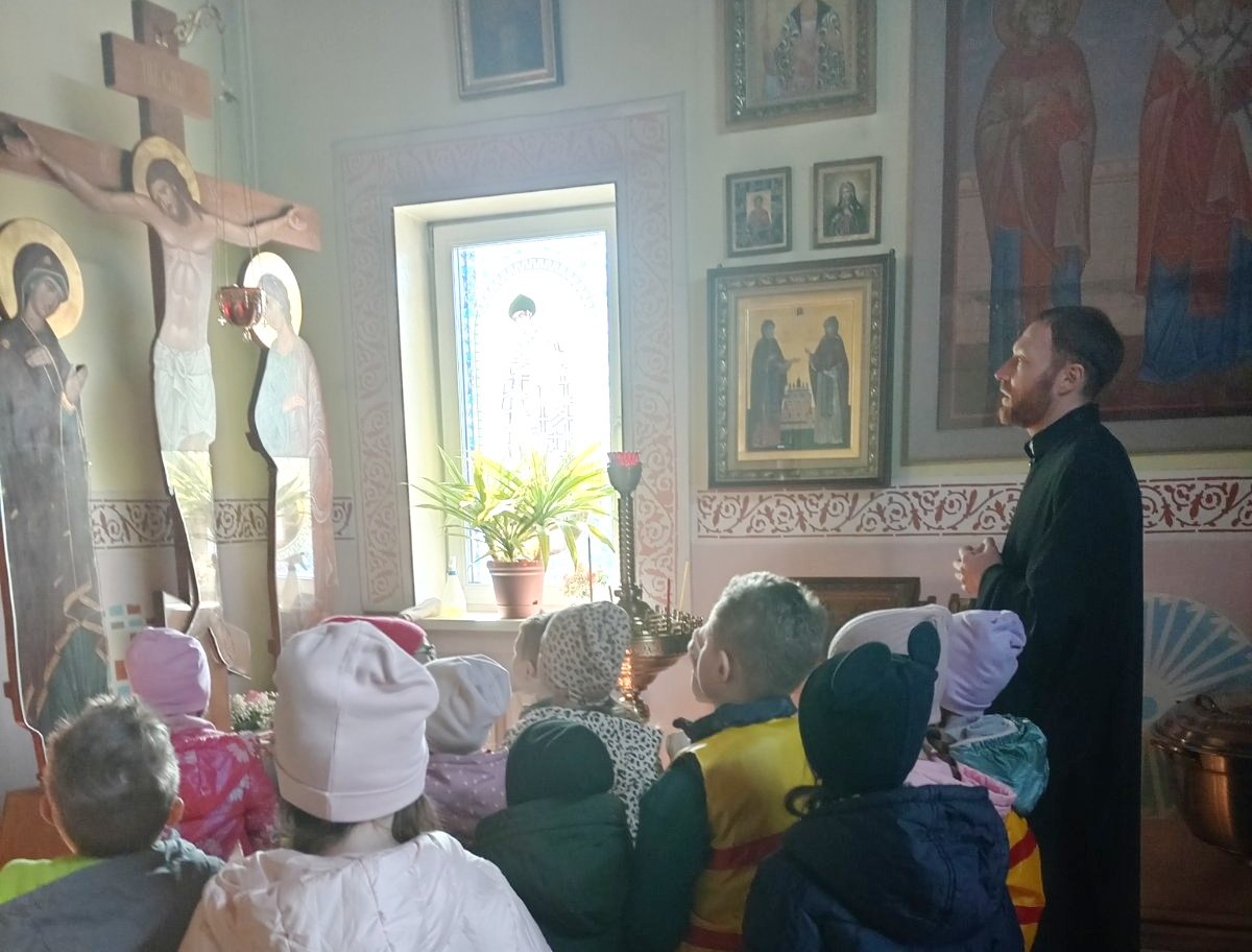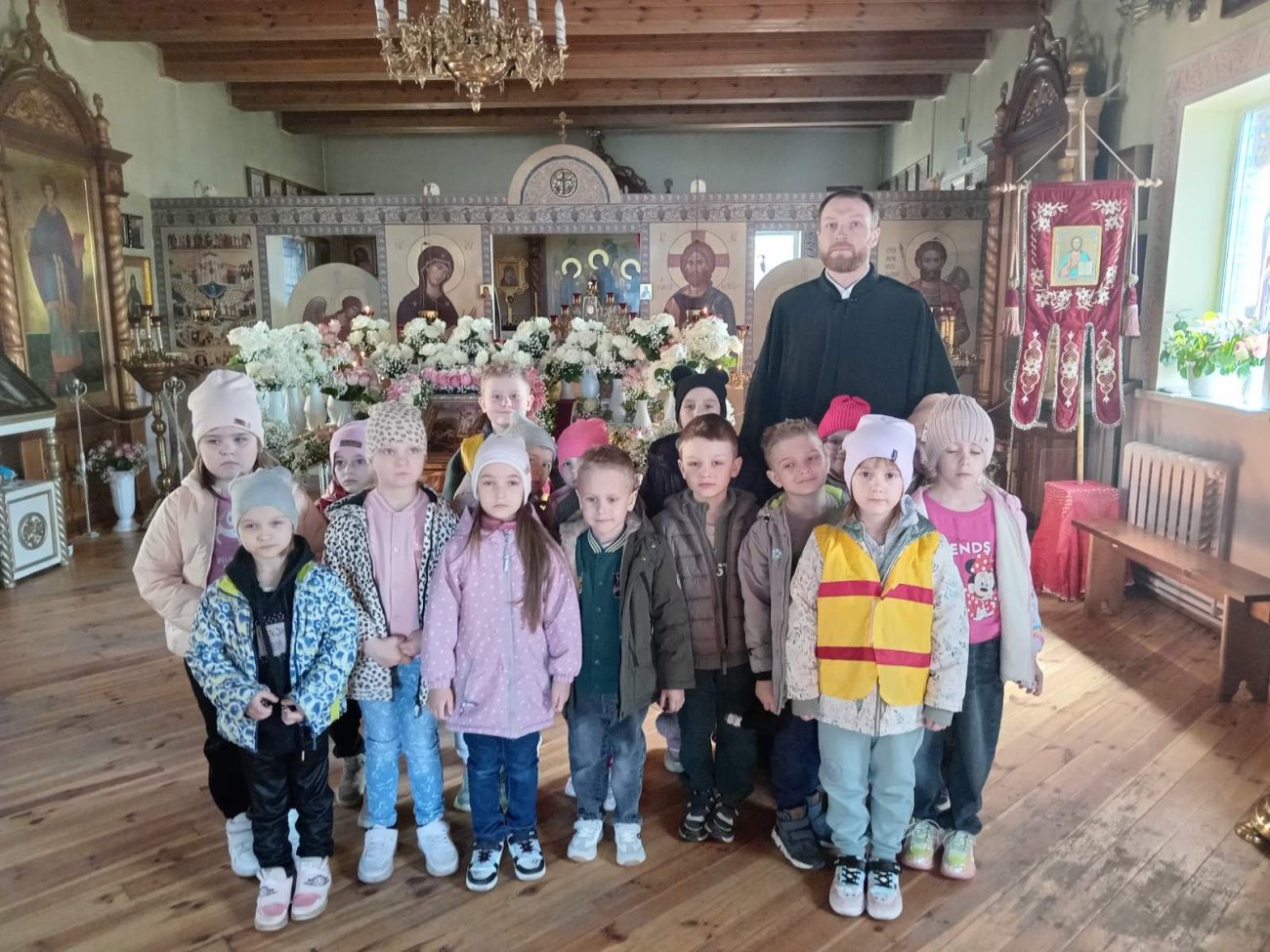 14 апреля клирик прихода храма святого мученика Иоанна Воина диакон Артемий Турыгин провёл экскурсию для воспитанников детского сада №39 г. Жлобина. Священнослужитель рассказал детям в доступной форме о Пасхе Христовой, о важности этого события для каждого человека на земле во все времена. Воскресение Христово, по слову святых отцов, является основанием христианской надежды, источником личного преображения и залогом грядущего воскресения всех верных. Также поговорили о послушании, не осуждении сверстников и проявлении доброты. Дети с интересом смотрели храмовые иконы и восхищались украшением из живых цветов.