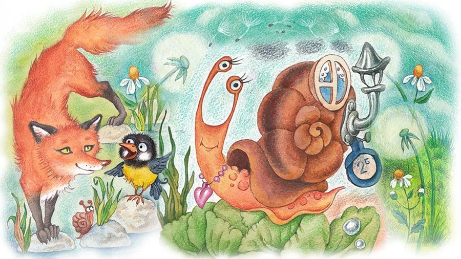 Что делать? Так стояли жуки, а улитка бегала вокруг них. Тогда старший жук придумал вот что. Из леса позвали самого прыткого лисенка (а с ним, конечно, прибежали и многие звери). Жуки взяли улиткин дом, забрались лисенку на спину… И, когда улитка поравнялась с ними, лисенок с жуками на спине побежал вровень с улиткой. Жуки уловили момент — и прикрепили улиткин дом на место.